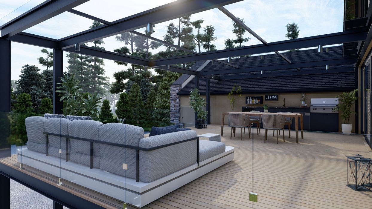 Above the carport, a spacious terrace has been created, offering a stylish outdoor living area complete with a seating lounge, dining space, and built-in kitchen. The use of glass balustrades and an open-plan layout maximizes views and natural light, delivering a sense of openness and luxury.